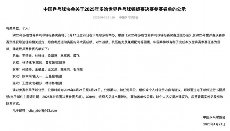 新华社北京4月21日电 中国乒乓球协会21日在官网对2025年多哈世界乒乓球锦标赛决赛中国队参赛名单进行了公示,王楚钦、林诗栋、孙颖莎、王曼昱等队员在列。