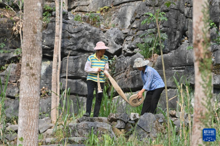 4月21日,广西马山县金钗镇龙印村村民在铺设水管,准备将当地政府送来的水引进水柜。