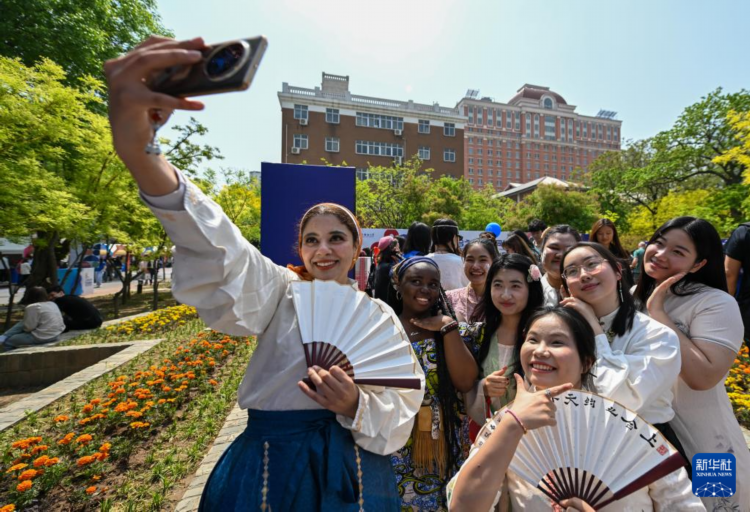 4月20日,中外青年在天津外国语大学第八届国际文化节上合影留念。