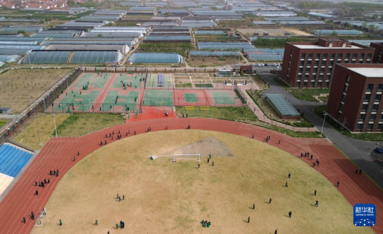 位于潍坊寿光市八里庄村的寿光市文圣学校(4月17日摄,无人机照片)。操场铺设了塑胶跑道。