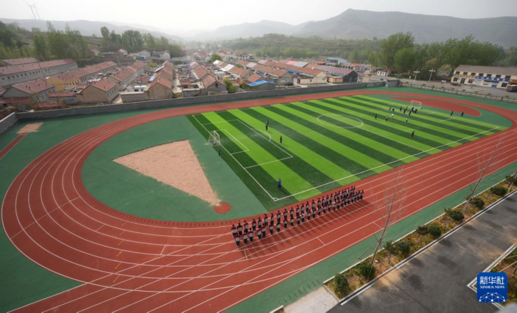 4月17日,在位于潍坊市临朐县石家河村的临朐县弥水教育集团石家河校区,学生在操场塑胶跑道上进行体育锻炼。