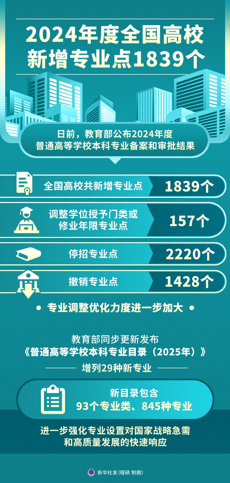 新华社北京4月22日电(记者王鹏)记者22日从教育部获悉,日前,教育部公布2024年度普通高等学校本科专业备案和审批结果,全国高校共新增专业点1839个,调整学位授予门类或修业年限专业点157个,停招专业点2220个,撤销专业点1428个,专业调整优化力度进一步加大。