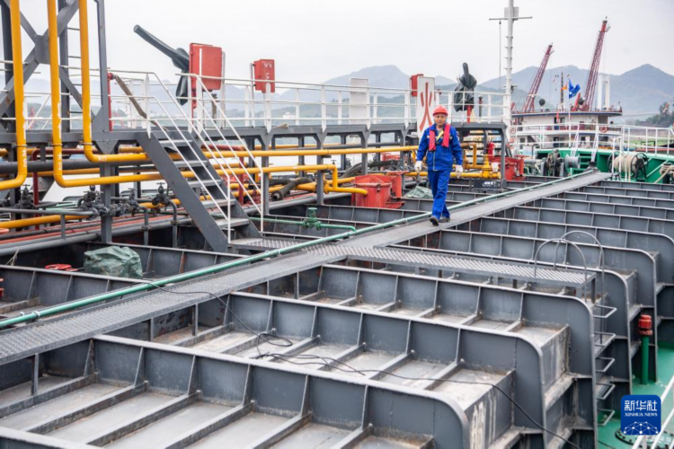 4月22日,在中国石化集团重庆川维化工有限公司物流码头,工作人员巡查货船。