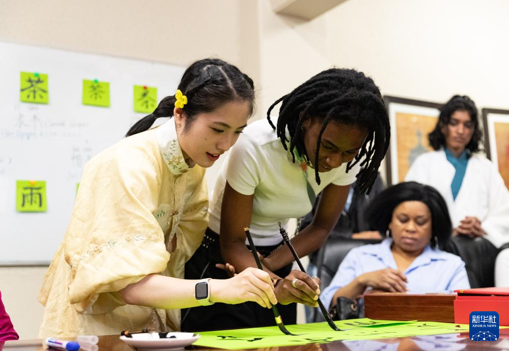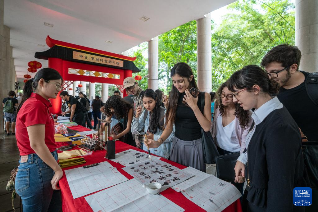 语言为礼,文化为桥——巴西里约庆祝“国际中文日” 4月15日,在巴西里约热内卢天主教大学举办的“国际中文日”庆祝活动上,学生们体验中文书法。 新华社记者 王天聪 摄