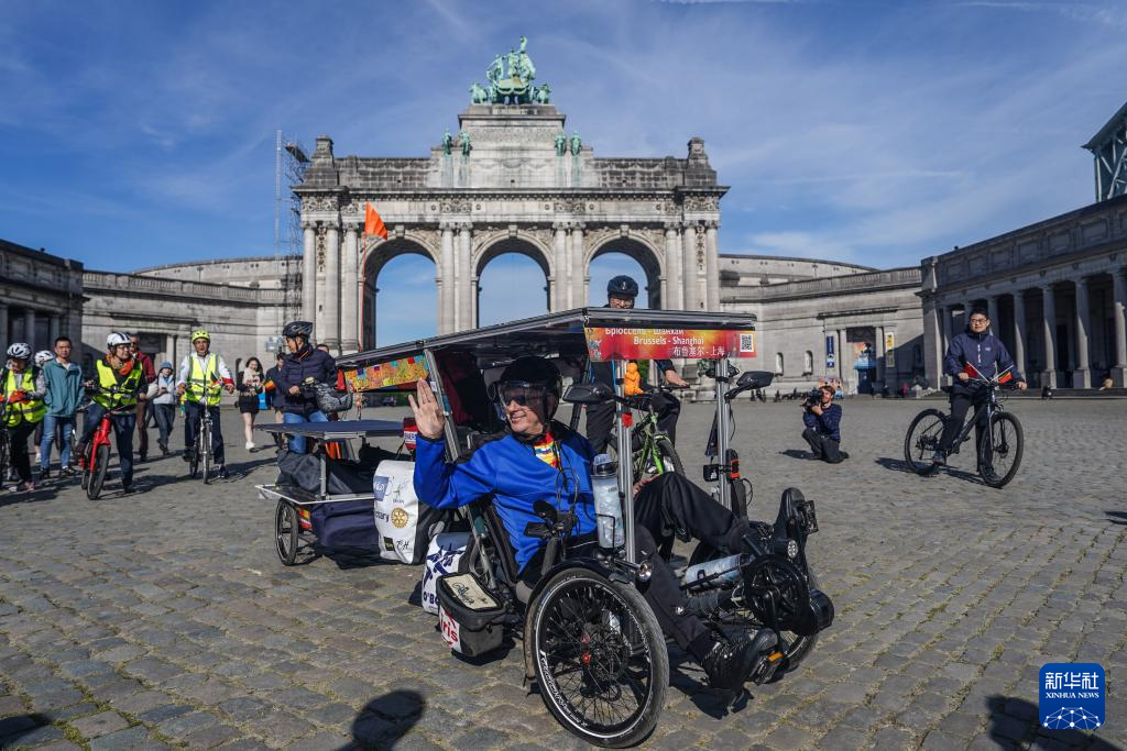 用车轮丈量广阔土地——比利时六旬骑行者开启“骑向上海”之旅 4月19日,在比利时首都布鲁塞尔的五十年宫汽车博物馆前,骑行爱好者克劳德·布鲁尔(中)向送行人群挥手致意。 年逾六旬的比利时骑行爱好者克劳德·布鲁尔4月19日上午从布鲁塞尔启程,踏上“骑向上海”绿色远程骑行之旅。布鲁尔此行使用自己组装的太阳能助力三轮车,整个行程预计历时4个多月。 新华社记者 彭子洋 摄