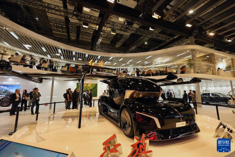 4月23日拍摄的红旗汽车展台上的飞行汽车天辇1号。