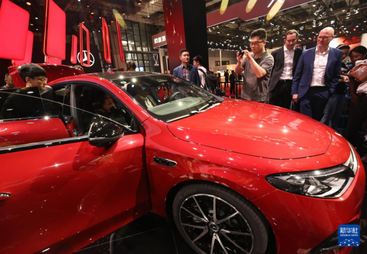 4月23日,参观者在奔驰汽车全球首秀纯电长轴距CLA汽车旁驻足观看。