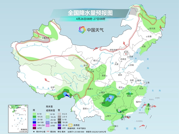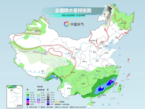 未来几天,南方还将持续多雨模式,其中今天强降雨的核心区域将集中在广东中北部、福建西南部和中北部等地。中央气象台预计,今天内蒙古东北部、黑龙江西北部、新疆沿天山地区、西藏北部、青海南部等地部分地区有小到中雪或雨夹雪,其中,内蒙古东北部、黑龙江西北部等地部分地区有大到暴雪。广东中北部、福建西南部和中北部、江西南部、浙江南部、西藏东南部等地部分地区有大到暴雨,福建中北部局地有大暴雨。