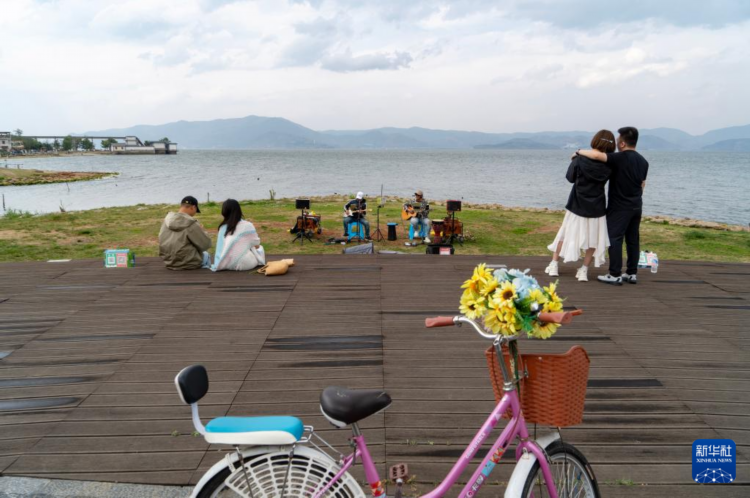 4月23日,游客在大理洱海边欣赏弹唱表演。