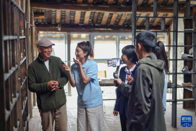 4月24日,在重庆市綦江区三角镇中坝村,“村书记”主播团在直播间和村民一起介绍乡村农耕文化。