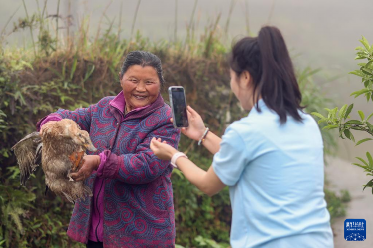 4月24日,在重庆市綦江区三角镇中坝村,短视频内容创作者庞芳(右)拍摄短视频推介内容。