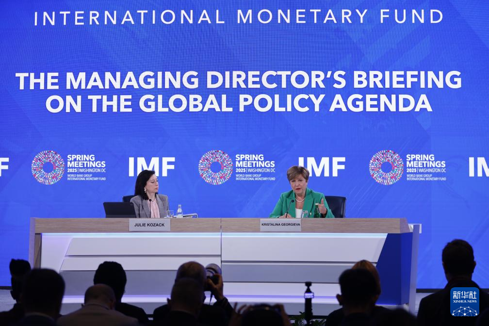 4月24日,国际货币基金组织(IMF)总裁格奥尔基耶娃(后右)在美国华盛顿出席媒体发布会。