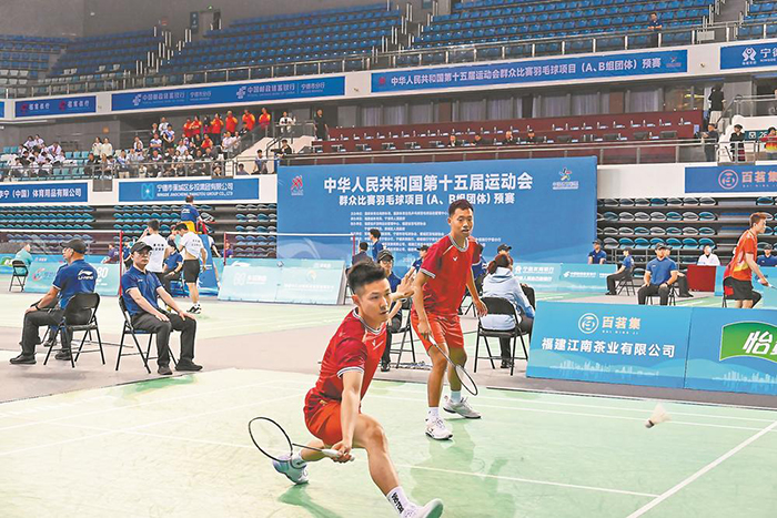 23日,第十五届全国运动会群众比赛羽毛球项目(A、B组团体)预赛在宁德市蕉城区开赛,来自全国各地的近600名运动员齐聚宁德市体育中心,在激烈角逐中展现群众体育风采。