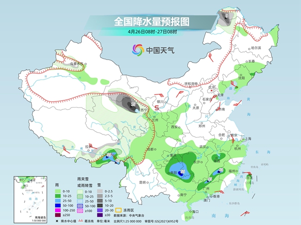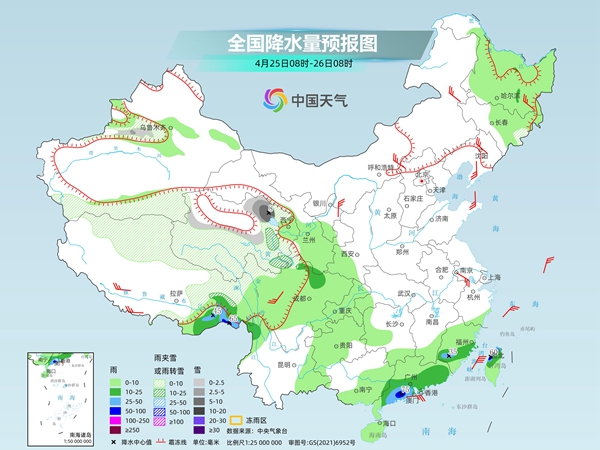 中央气象台预计,今天,新疆沿天山地区和南疆南部、西藏北部和东部、青海大部、甘肃南部、川西高原北部等地部分地区有小到中雪或雨夹雪,局地有大雪。西藏东南部、四川盆地西北部、云南西北部、福建中南部、广东南部、台湾岛北部等地部分地区有中到大雨,其中,西藏东南部、广东西南部、台湾岛西北部等地部分地区有暴雨。