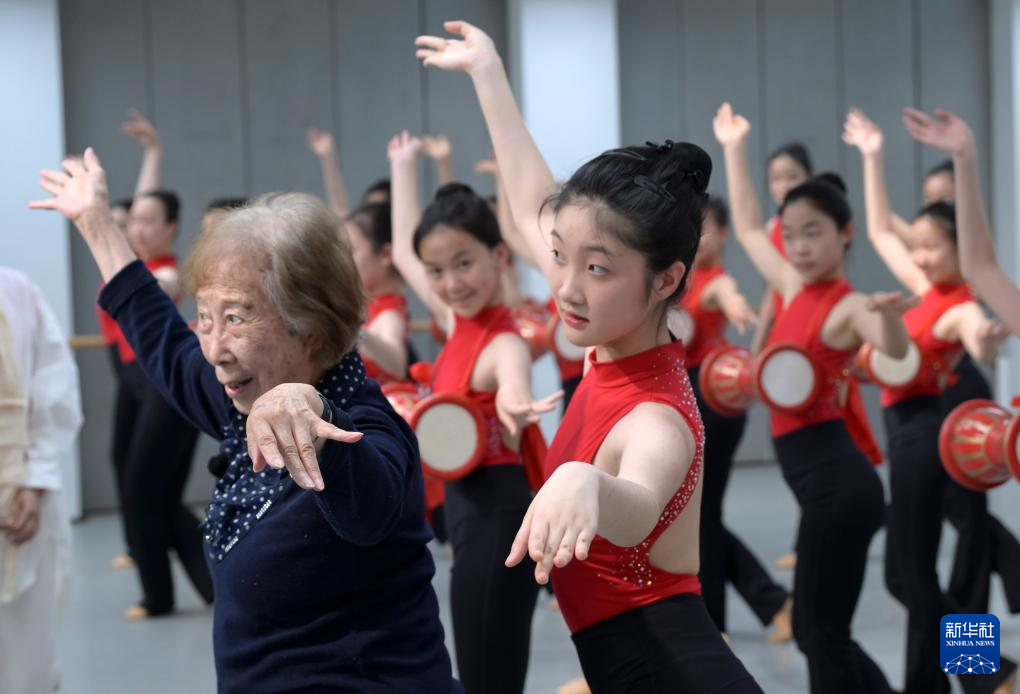 4月25日,高金荣(左一)为学生指点敦煌舞动作要领。