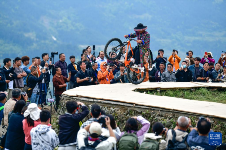 4月26日,表演者在贵州省从江县加榜梯田的梯田走秀活动上展示车技。