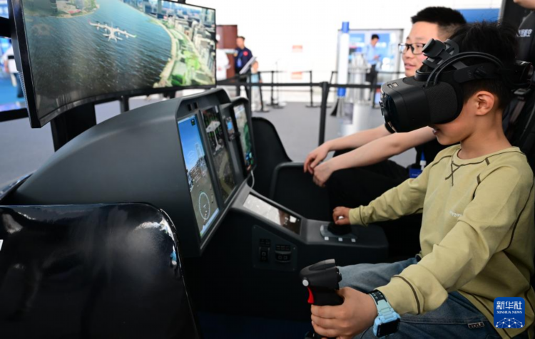 4月26日,小朋友在第三届中国(安徽)科技创新成果转化交易会上体验一款驾驶舱模拟器。