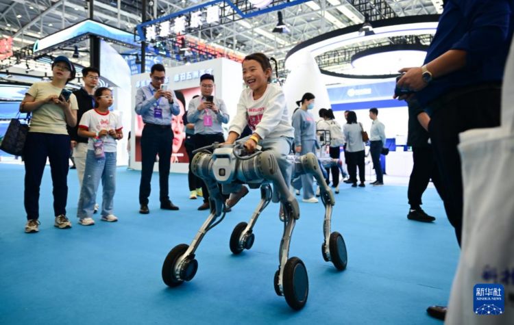 4月26日,小朋友在第三届中国(安徽)科技创新成果转化交易会上体验一款机器狗。