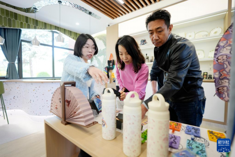 4月23日,“丝路宁夏文创”团队成员、宁夏大学民族与历史学院博士后苗亚婻 (左一)向客户介绍文创产品。