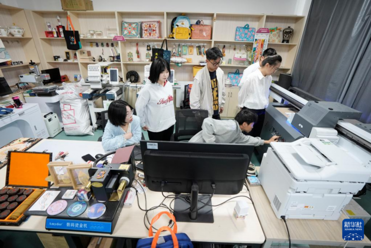 4月23日,“丝路宁夏文创”团队成员在实训室设计、制作文创产品。