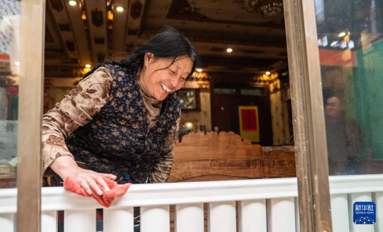 4月26日,那曲市团结小区居民在擦拭暖气片。