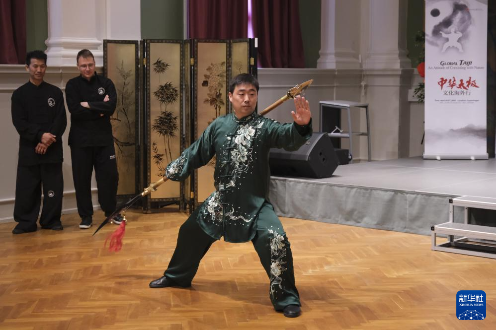 4月25日,在丹麦首都哥本哈根,陈氏太极拳弟子表演太极器械功夫。