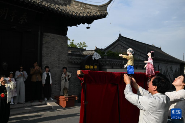 当日,在江苏省高邮市运河·盂城驿街区,木偶戏、挑花担、撂石锁等非遗项目表演吸引众多游人驻足观看。