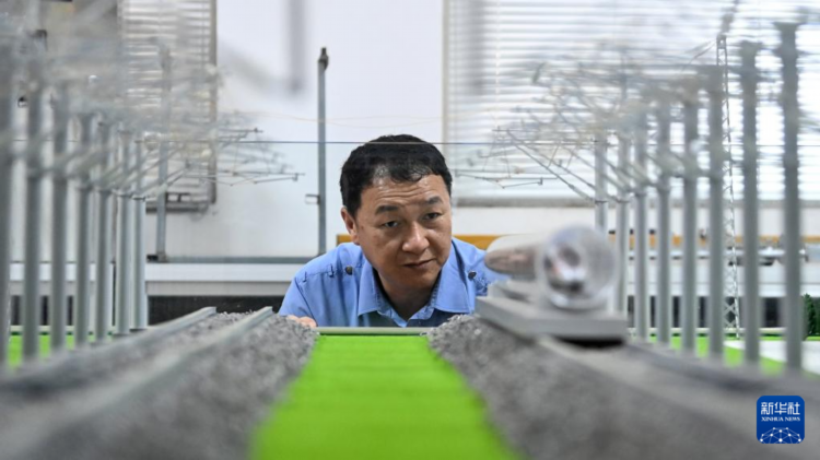 彭春林在彭春林创新工作室通过观察沙盘思考研发项目的运用(4月25日摄)。