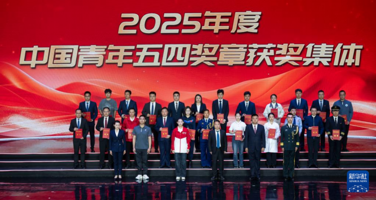 4月30日,2025年度中国青年五四奖章获奖集体代表在颁奖活动上合影。新华社记者 才扬 摄