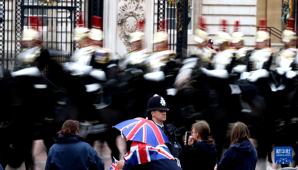 5月5日,在英国伦敦,准备参加阅兵仪式的军人经过白金汉宫。