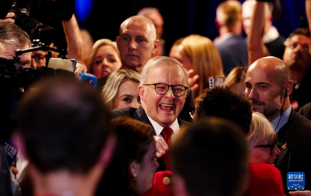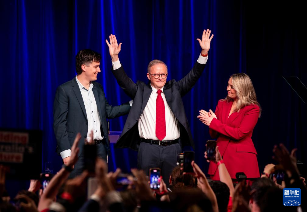 5月3日,在澳大利亚悉尼,澳大利亚总理阿尔巴尼斯(中)在竞选集会上庆祝胜利。