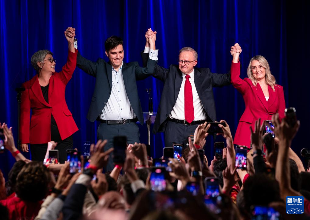 5月3日,在澳大利亚悉尼,澳大利亚总理阿尔巴尼斯(右二)与澳大利亚外长黄英贤(左一)在竞选集会上庆祝胜利。
