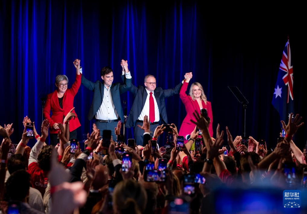5月3日,在澳大利亚悉尼,澳大利亚总理阿尔巴尼斯(右二)与澳大利亚外长黄英贤(左一)在竞选集会上庆祝胜利。