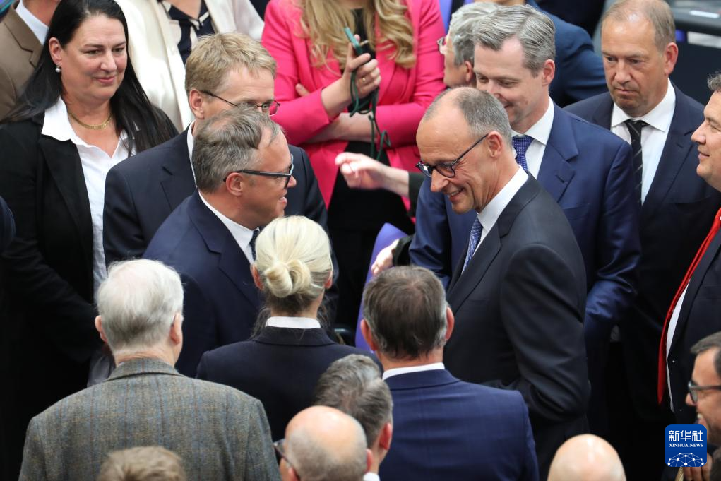 5月6日,在德国首都柏林的国会大厦,默茨(中右)当选后接受祝贺。新华社记者 杜哲宇 摄