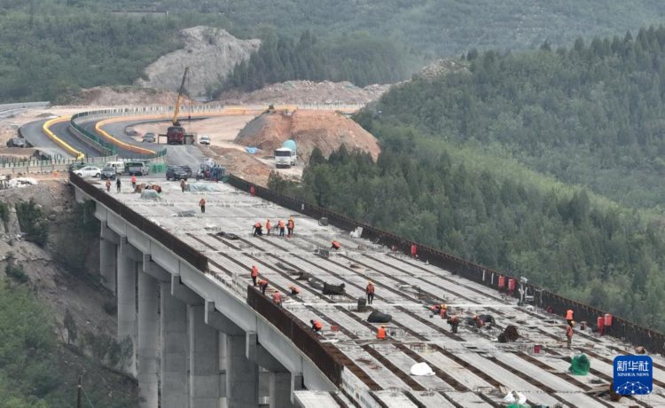 5月7日,工人在石太高速公路改扩建项目核桃园4号桥建设工地施工(无人机照片)。