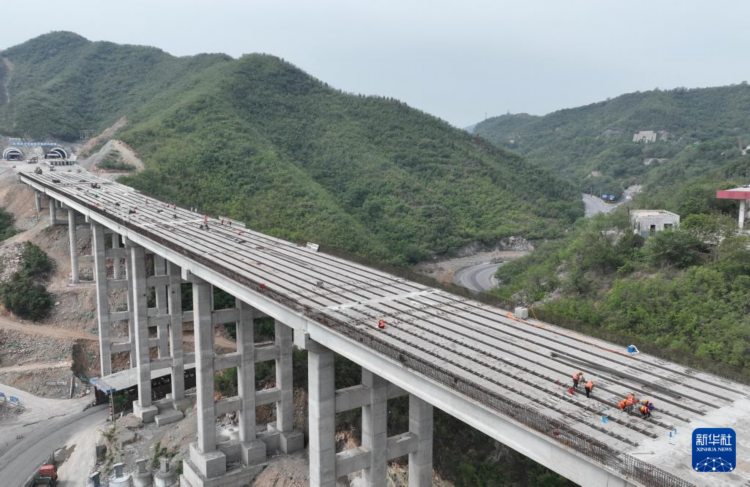 5月7日,工人在石太高速公路改扩建项目核桃园4号桥建设工地施工(无人机照片)。