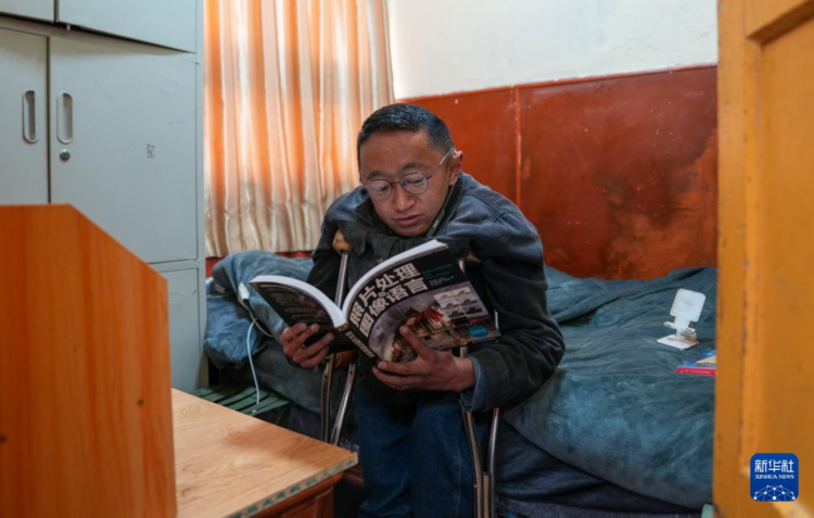 拉巴顿珠在公司宿舍学习摄影知识(5月5日摄)。