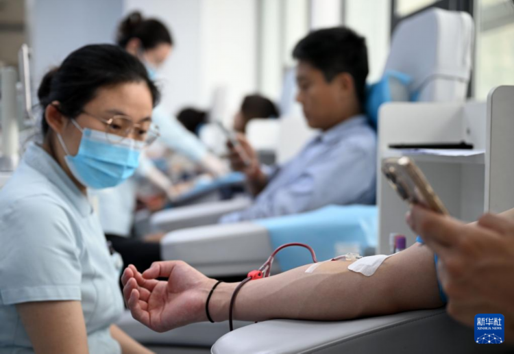 5月7日,在天津市血液中心,护士查看献血者的状态。