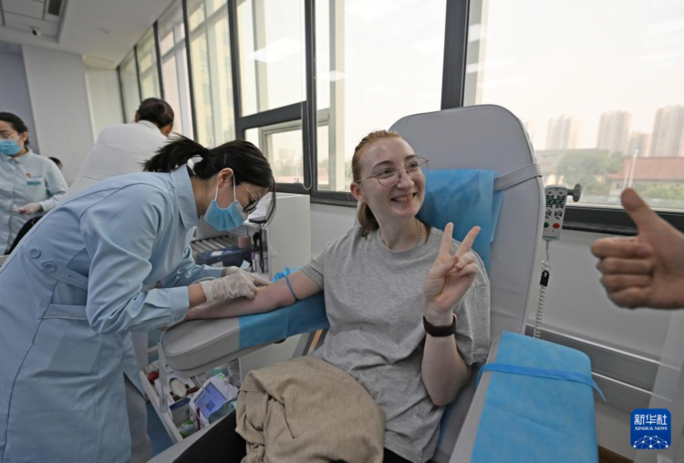 5月7日,一名留学生在天津市血液中心准备献血。