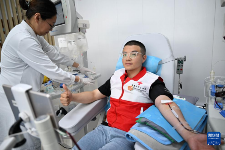 5月7日,一名红十字会志愿者在天津市血液中心献血。