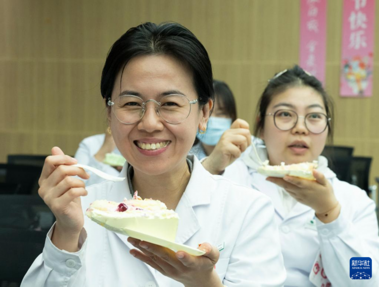 5月8日,在北京按摩医院(朝阳院区),医护人员在品尝蛋糕。