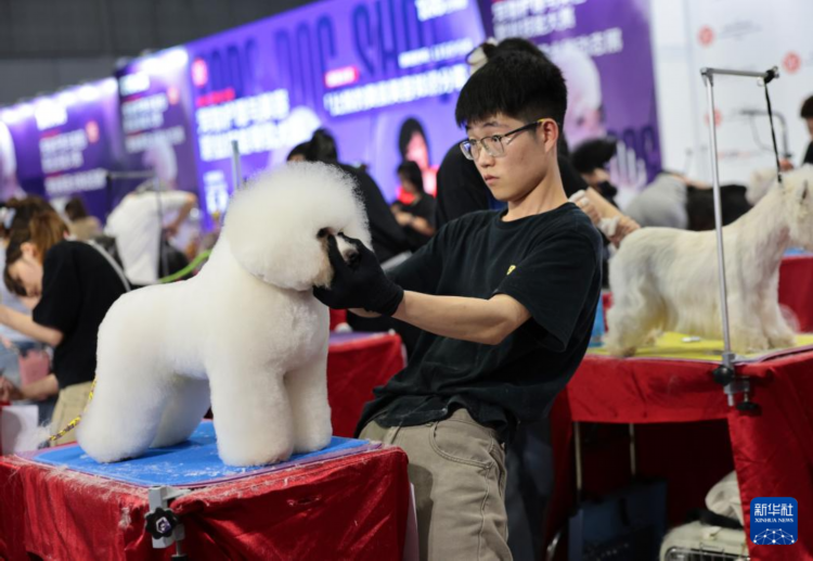 5月8日,一名宠物美容师在展览现场举行的宠物美容大赛上为模特犬修剪毛发。