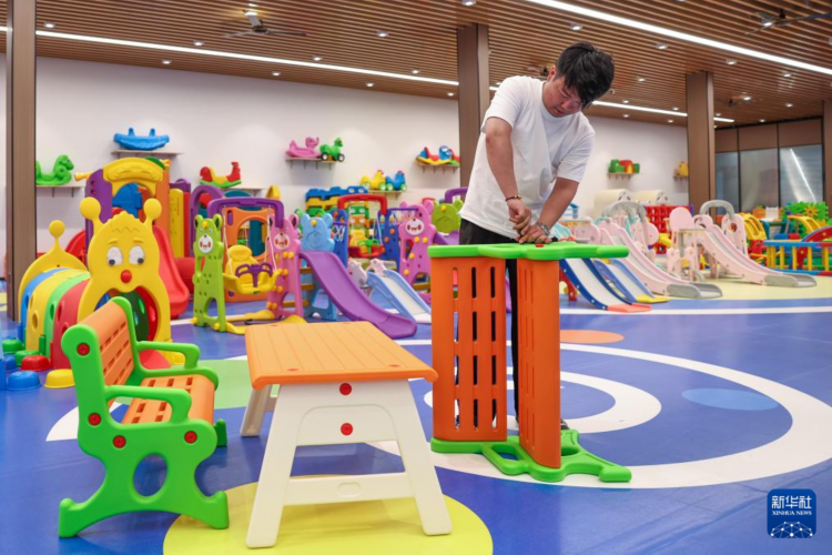 5月8日,浙江中凯游乐设备有限公司员工在样品室内组装一款新生产的教玩具产品。