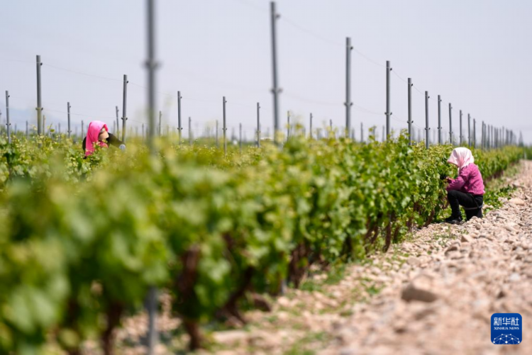 近日,宁夏贺兰山东麓种植的酿酒葡萄进入结果关键期,当地酒庄组织工人对葡萄藤进行抹芽、剪枝等管护工作,以保证葡萄长势。