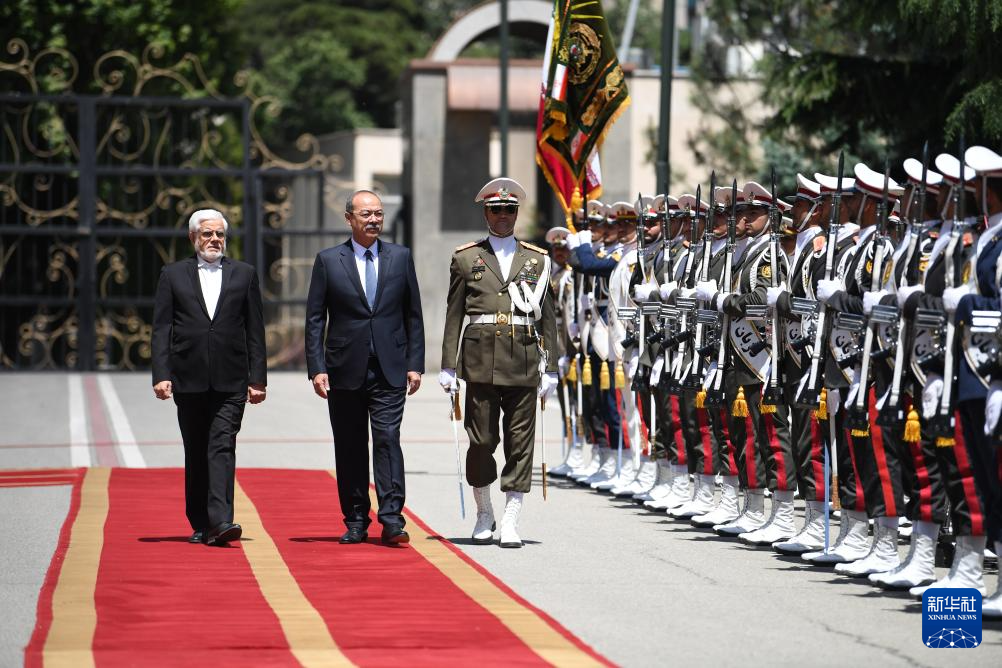 5月11日,在伊朗首都德黑兰,伊朗第一副总统阿雷夫(左一)与到访的乌兹别克斯坦总理阿里波夫(左二)在欢迎仪式上检阅仪仗队。