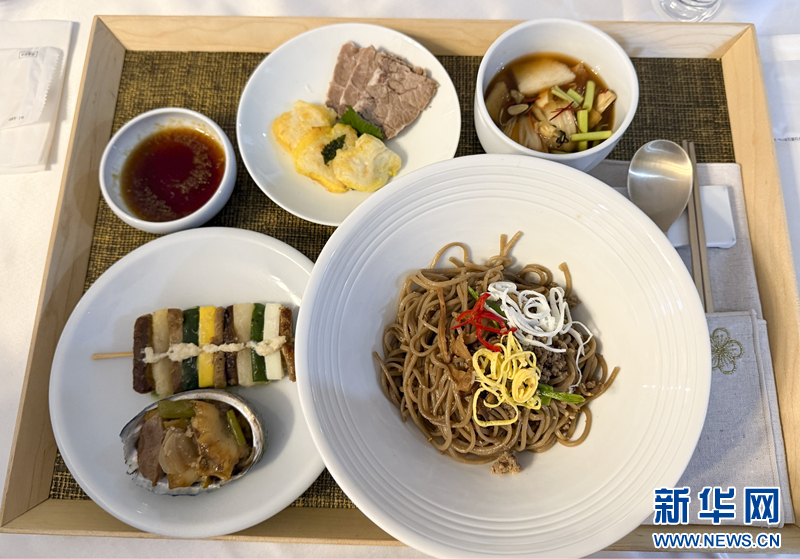 这是游客体验的韩式宫廷美食套餐,包括骨董面、酱烧鲍鱼、华阳串、香煎油鱼、白切肉和水泡菜。记者 姚琪琳 摄