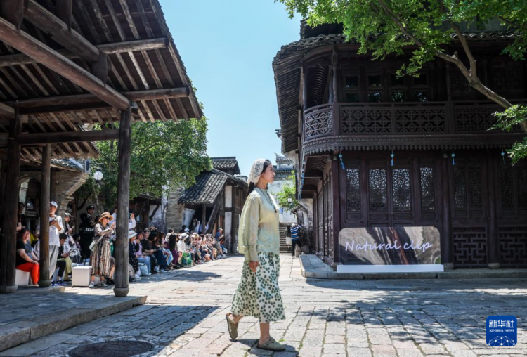 5月12日拍摄的濮院时尚古镇老街上举行的时装周“自然剪辑时装秀”。