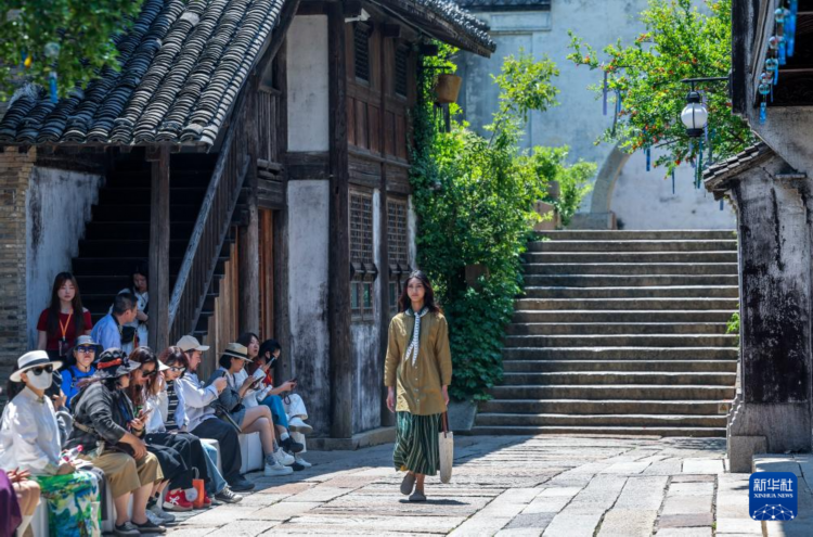 5月12日拍摄的濮院时尚古镇老街上举行的时装周“自然剪辑时装秀”。