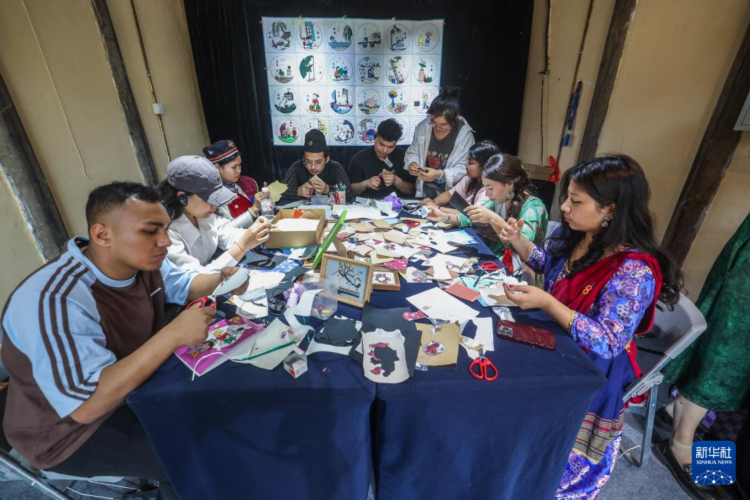 5月12日,在濮院时尚古镇的一家拼布工作坊内,外国游客在体验布艺创意拼贴。