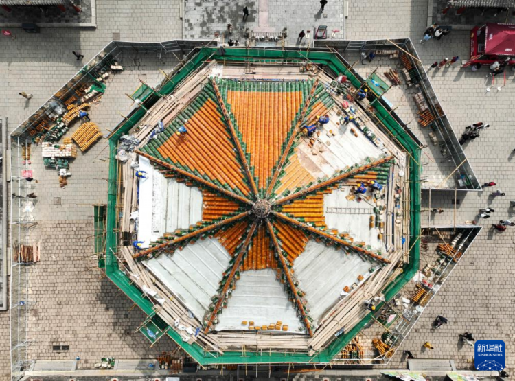 这是2025年4月6日拍摄的保养维护中的沈阳故宫大政殿(无人机照片)。